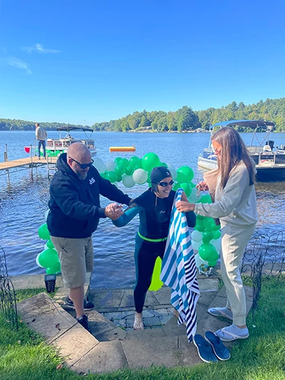“My second challenge was that, due to the rods in my back, I cannot sight ahead while I’m swimming. Every time I would try, my feet would drop down and I would just about come to a stop.” As this abrupt starting and stopping was impeding her progress, Bonnie and her husband devised a plan. “Todd put a long white pole on the front of our boat with a red flag at the end of it. When I took a breath to the right, I would see water, trees, or houses. When I took a breath to the left, I would see the red flag, the boat, and Todd. Todd was going to be my sight. It took me the whole summer, but by the day of the three-mile swim, I didn’t try once to sight myself. During our practice swim segments, we figured the total swim would take three hours. To our surprise that day, we finished in two hours and 35 minutes.”