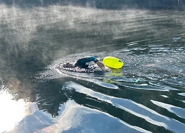 Swimming in open water presented new difficulties even for a veteran swimmer like Bonnie. “I can’t tread water with total spinal fusion—that was the first challenge,” she offers. “My stepson Adam suggested I get a pair of mini-fins. Since it was November in the Northeast, I was only able to use them in my swim spa. Once summer came, I did find they were a great help in treading water.” Training year-round was a natural progression for Bonnie, who keeps her back healthy by frequently swimming against a current. “Although I did not use the swimming fins in the three-mile swim, I found they were the best help in gaining strength throughout my whole body during the winter," she says.